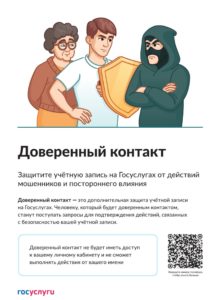 Минцифры России создан сервис «Доверенный контакт», который направлен на повышение уровня цифровой безопасности граждан и защиту их персональных данных при использовании портала государственных и муниципальных услуг. Это дополнительная защита учетной записи на Госуслугах. Чтобы узнать больше, следует навести камеру телефона на код на плакате.